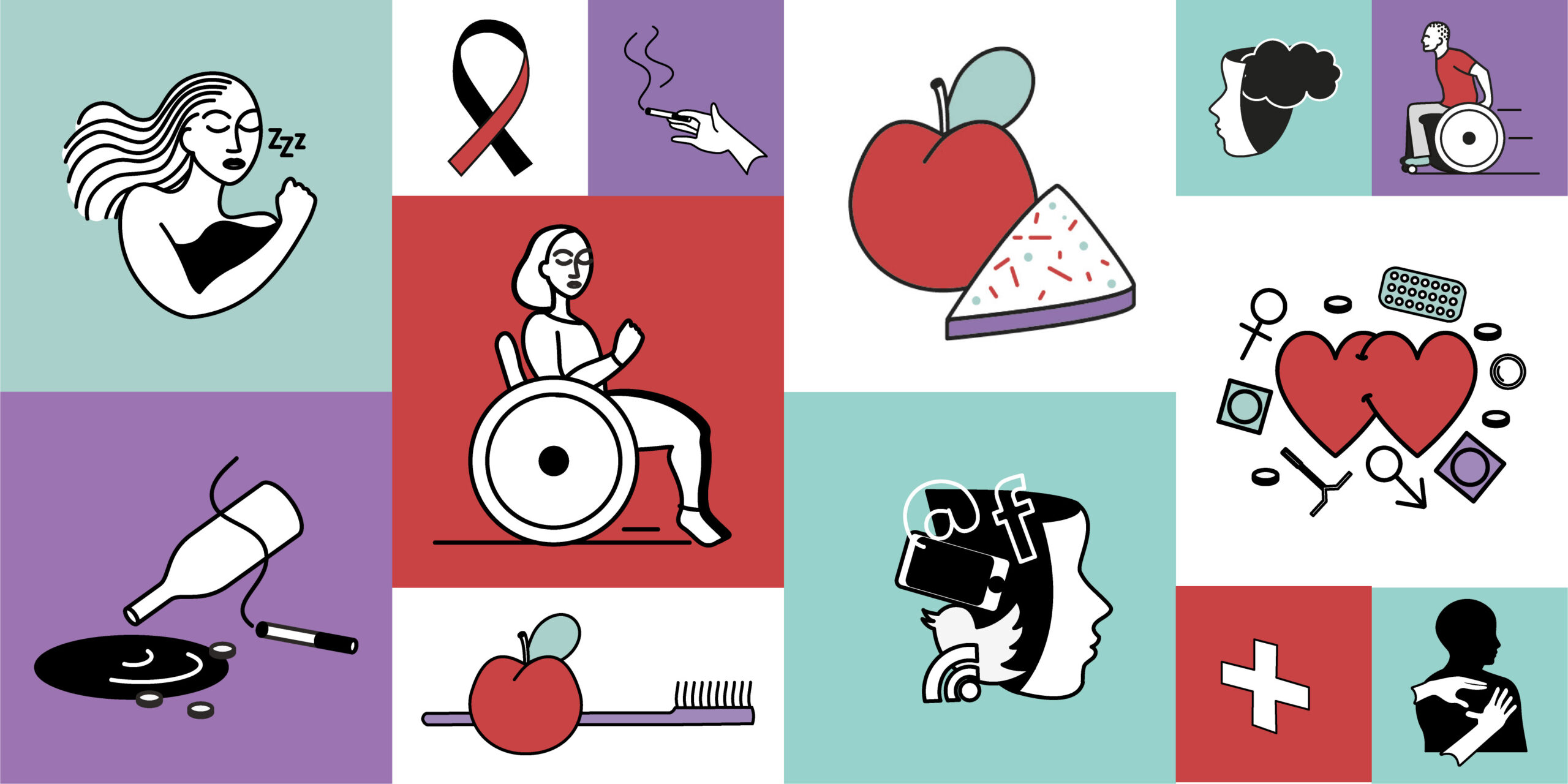 – Design de pictogrammes illustrant différents domaines de santé publique.