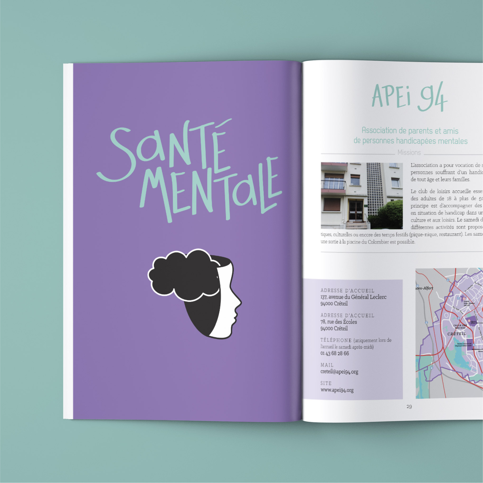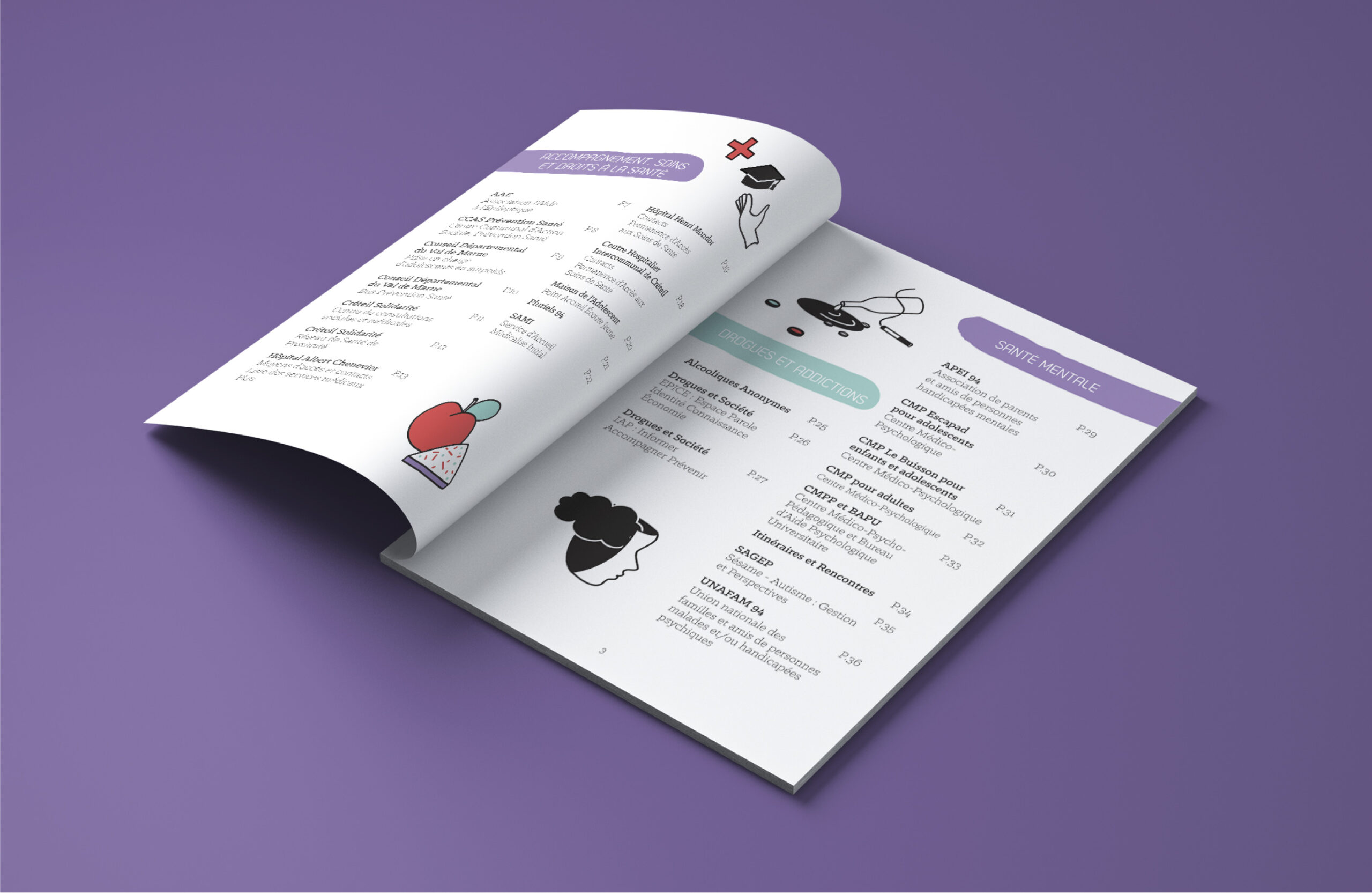 – Dans la même lignée graphique, création d’un annuaire Santé des Jeunes de 52 pages.