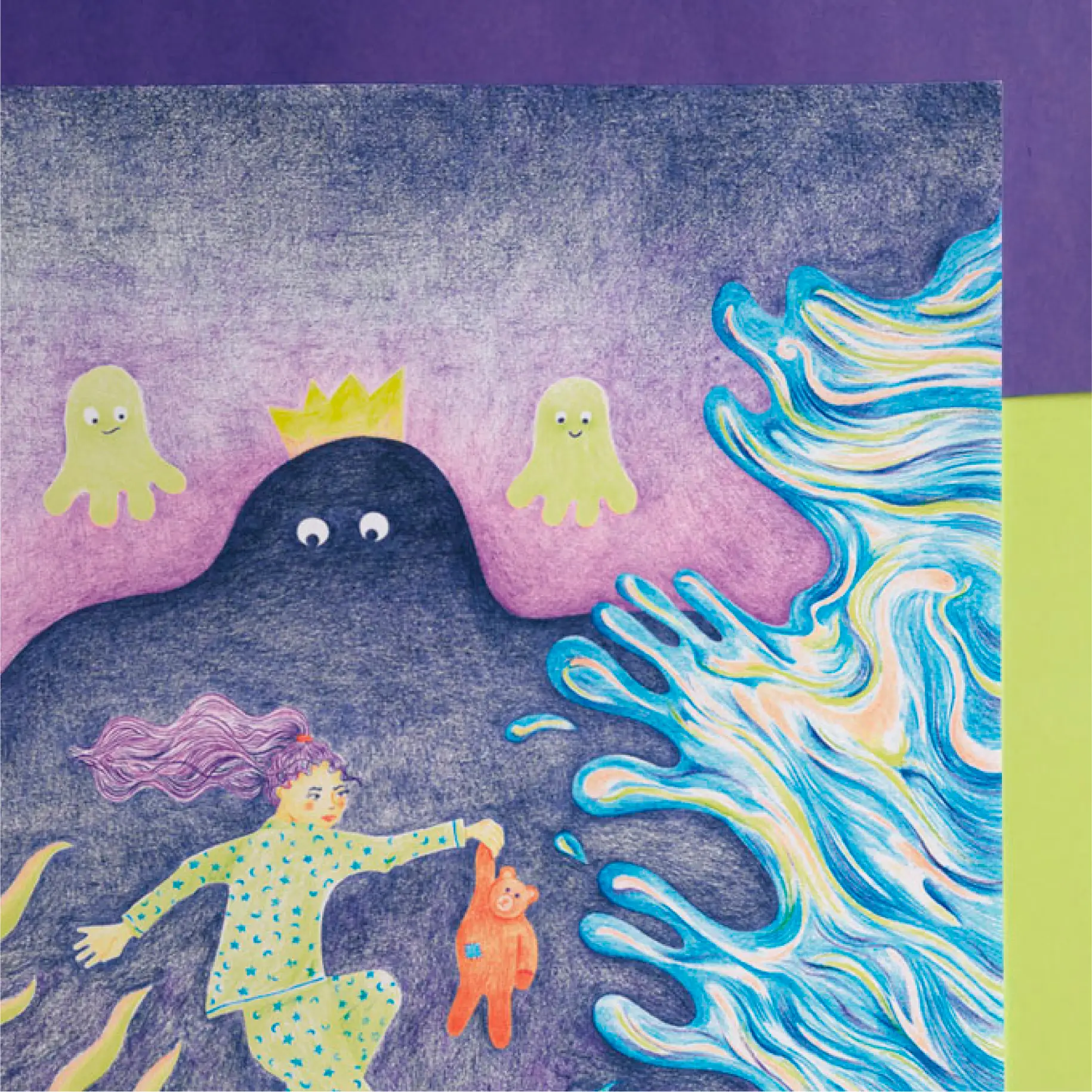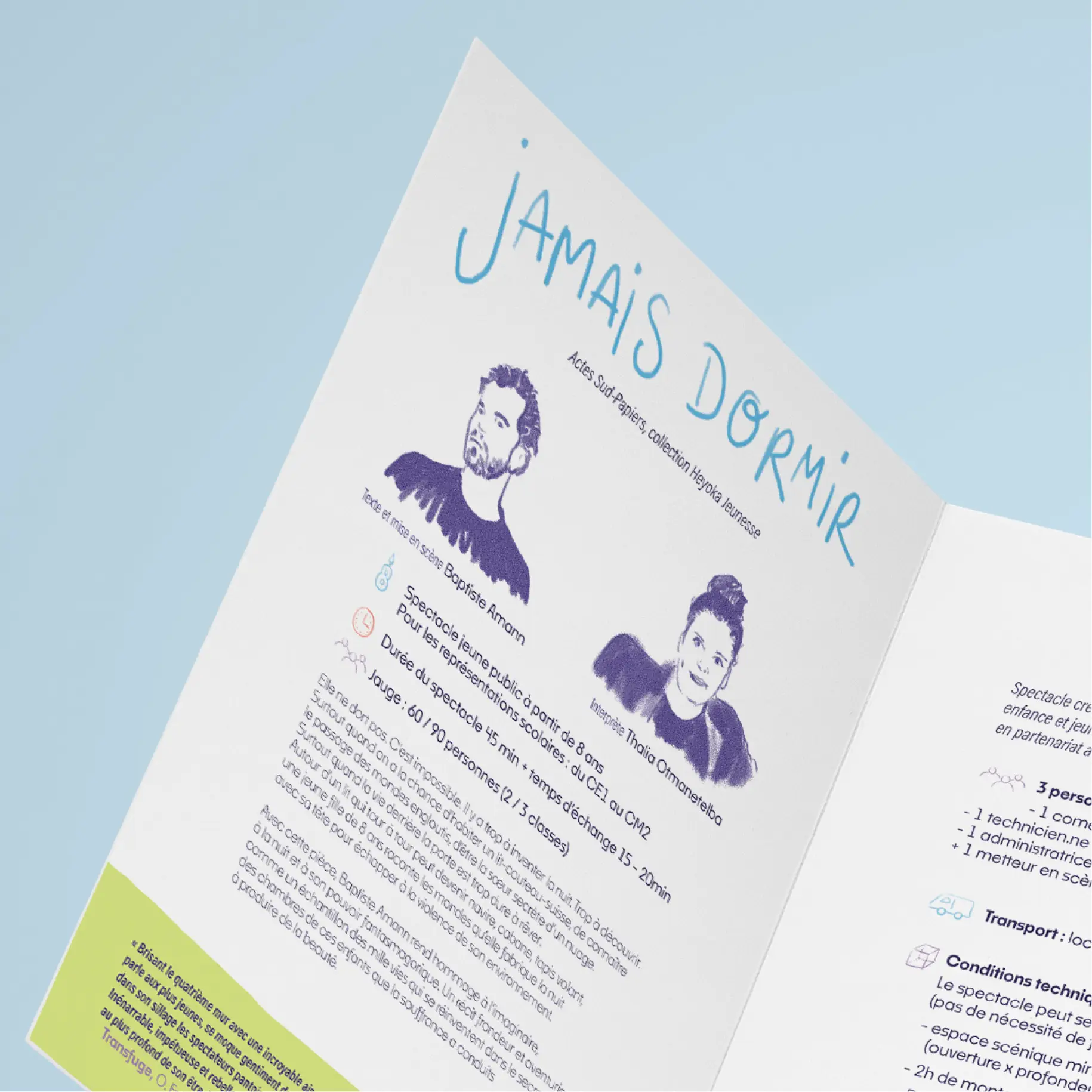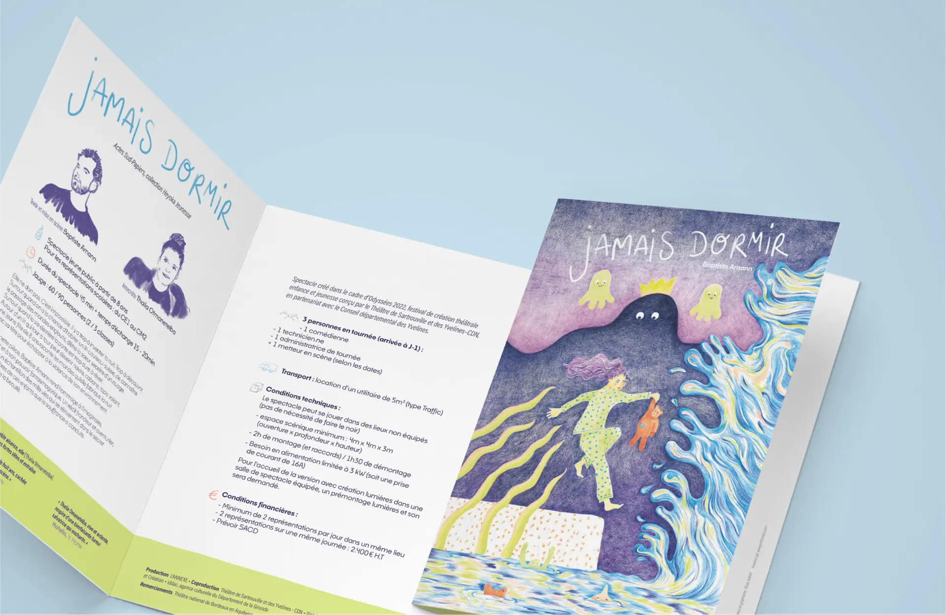 Création d’une illustration originale pour le spectacle Jamais Dormir de Baptiste Amann (Compagnie l’Annexe). Dessin réalisé à la main, aux crayons de couleur.